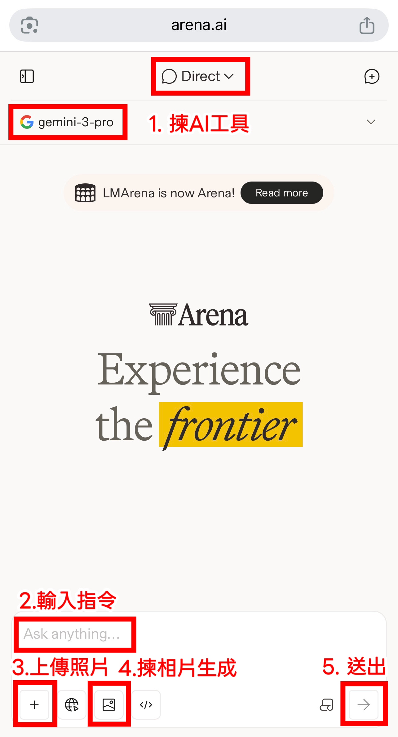 去呢個網站:https://arena.ai,揀「Direct」入面嘅「gemini-3-pro」模式 ,輸入指令並上傳照片,再揀相片生成 (揀完要check返上面嘅AI工具係咪用緊「gemini-3-pro」,因為有時會跳咗去其他模式),最後send出去等系統生成相片就ok啦~